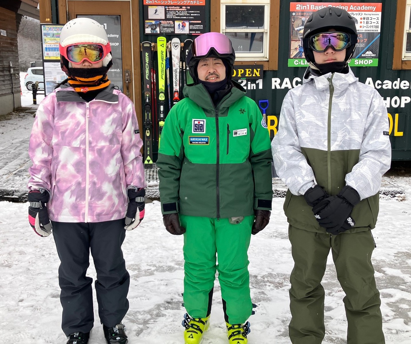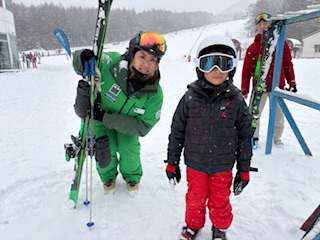 K君の担当は譲コーチ。今年も一緒にたくさん滑りましょう。午後からのH君の担当は咲奈コーチ。バリエーション練習頑張りました。