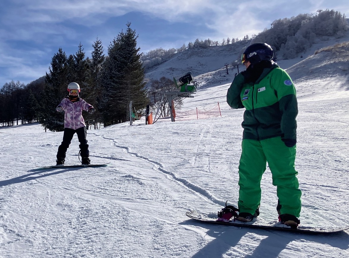 今年もJ君Sちゃんのお二人がプライベートレッスンにいらっしゃいました。22日は譲コーチとスキー。23日はSちゃんはボード初挑戦。咲奈コーチ担当です。