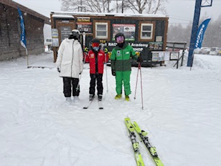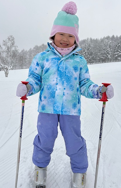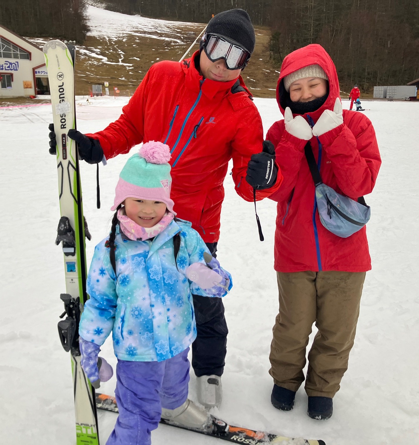 Lちゃんはハの字で止まれてターンも少し出来るようになりました。リフトも乗って、ご機嫌でレッスンを終えました。パパ、ママと一緒の写真です。